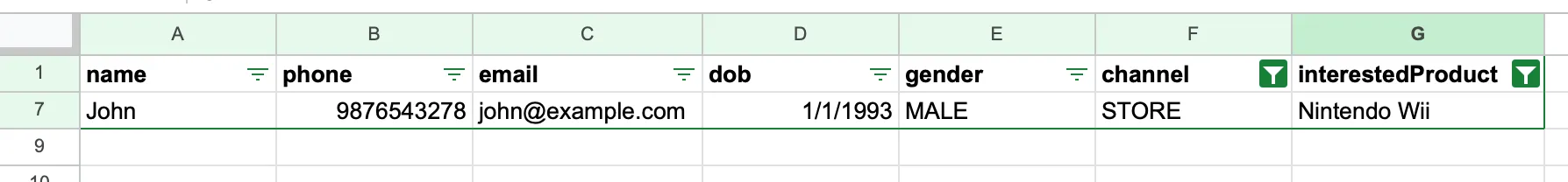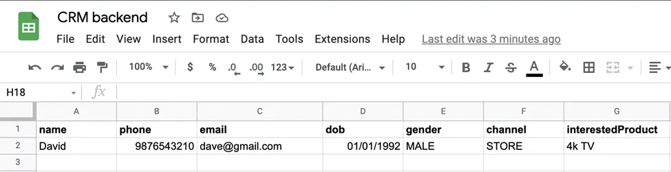 Go to the Chrome browser address bar and type sheet.new to generate a new sheet. Provide the column names in the first row, which will serve as our metadata. In the first row, we enter the details we would like to capture as a part of this CRM. Then, insert some data in the second row. My sheet currently looks like this: