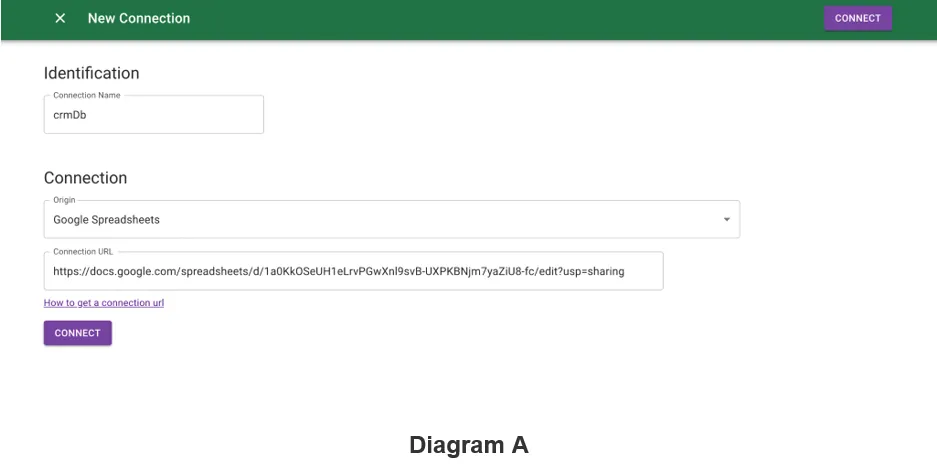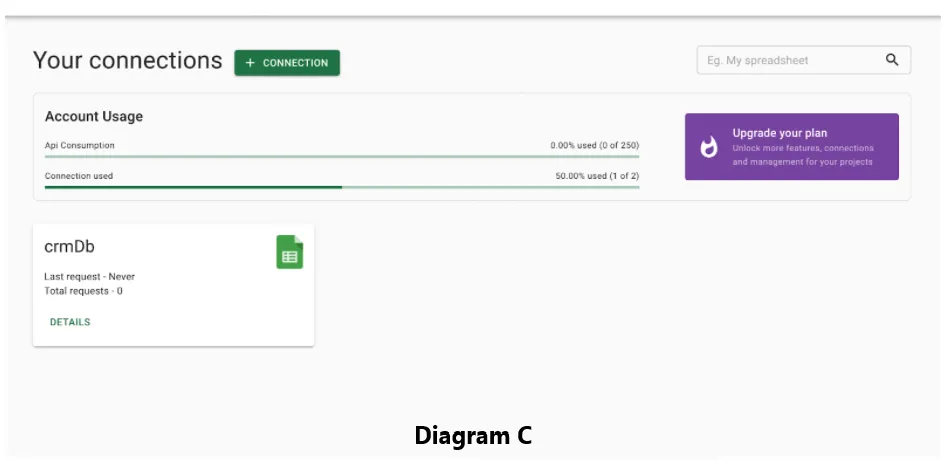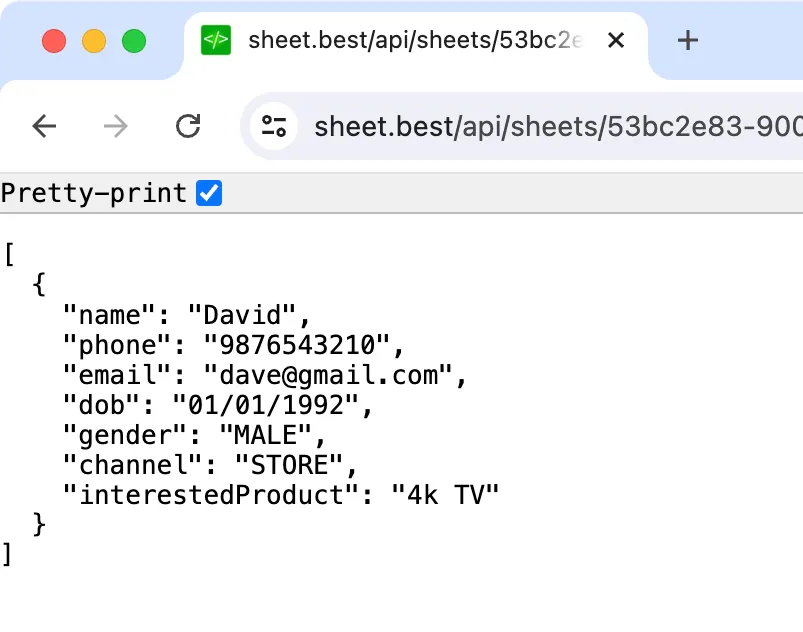 To test the API for the sheet we linked just now, click on the DETAILS button under the crmDb (Diagram C) connection and copy the connection URL. Paste it in the browser address bar, and you should be able to see the JSON response of the details that we configured in the sheet earlier. In this case, we see the single customer details that we configured earlier.