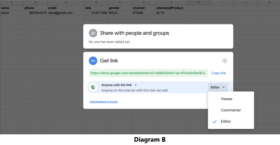 In the connection link of Sheet Best (Diagram A), paste the Google sheet link created in Diagram B. Make sure to change the settings to âAnyone on the internet with this link can viewâ (Diagram B); or else it will not work. Also, from the dropdown that appears while sharing the sheet, make sure to select âEditorâ so that we would be able to write to this sheet via APIs.