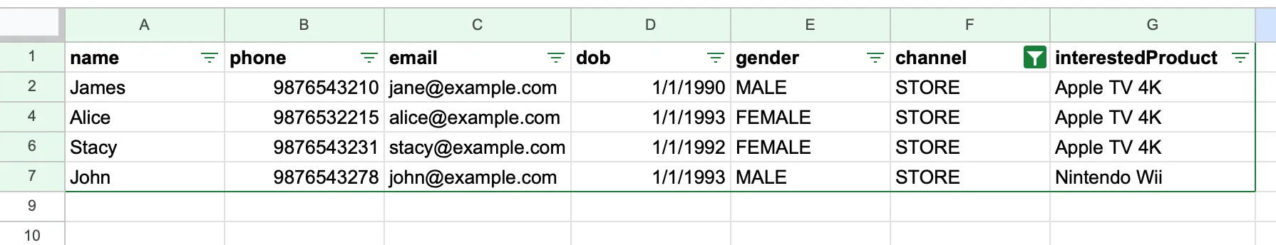 At some future point in time, a new stock of 4k TVs comes in, and we want to inform the prospective customers that we can do the same by filtering on the Interested Product column this time.