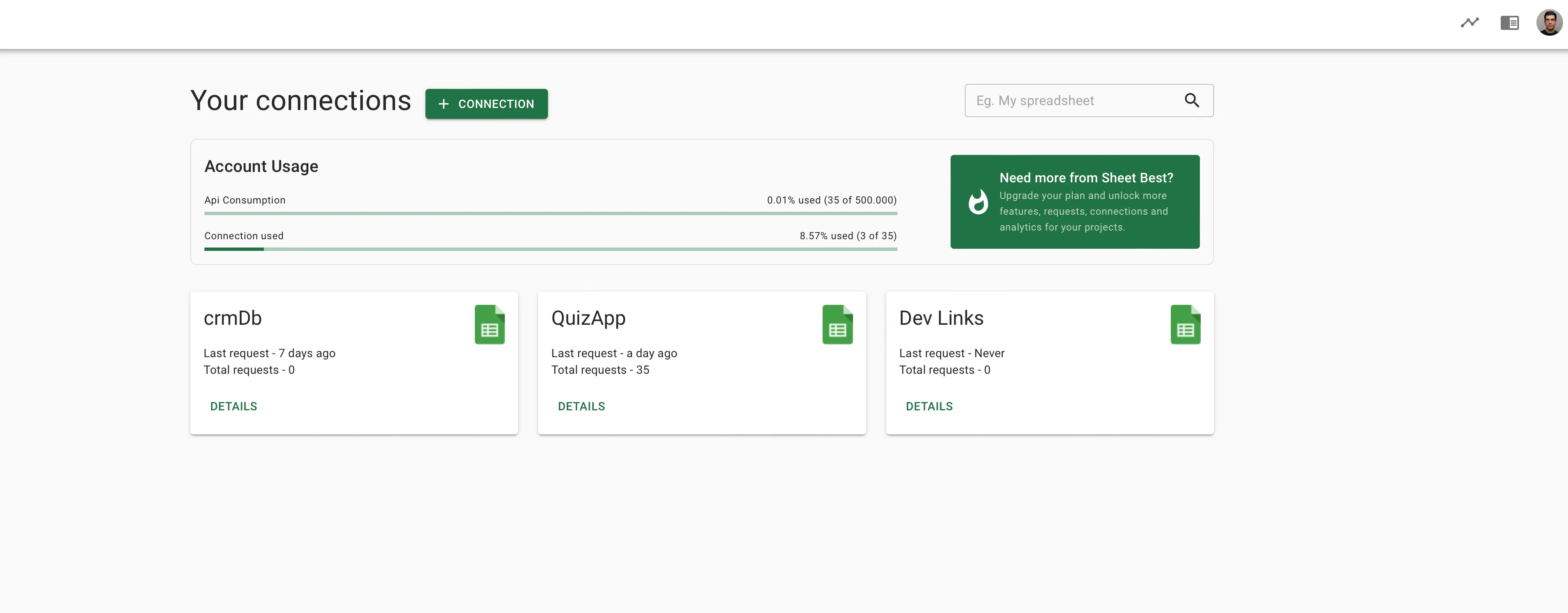That is where an important utility comes into the picture. That is Sheet Best. It would help communicate with our google sheet via REST APIs. This means we can perform well-known REST operations like GET, PUT, POST, and communicate with our sheets database. Sounds amazing right? Let’s set that up.