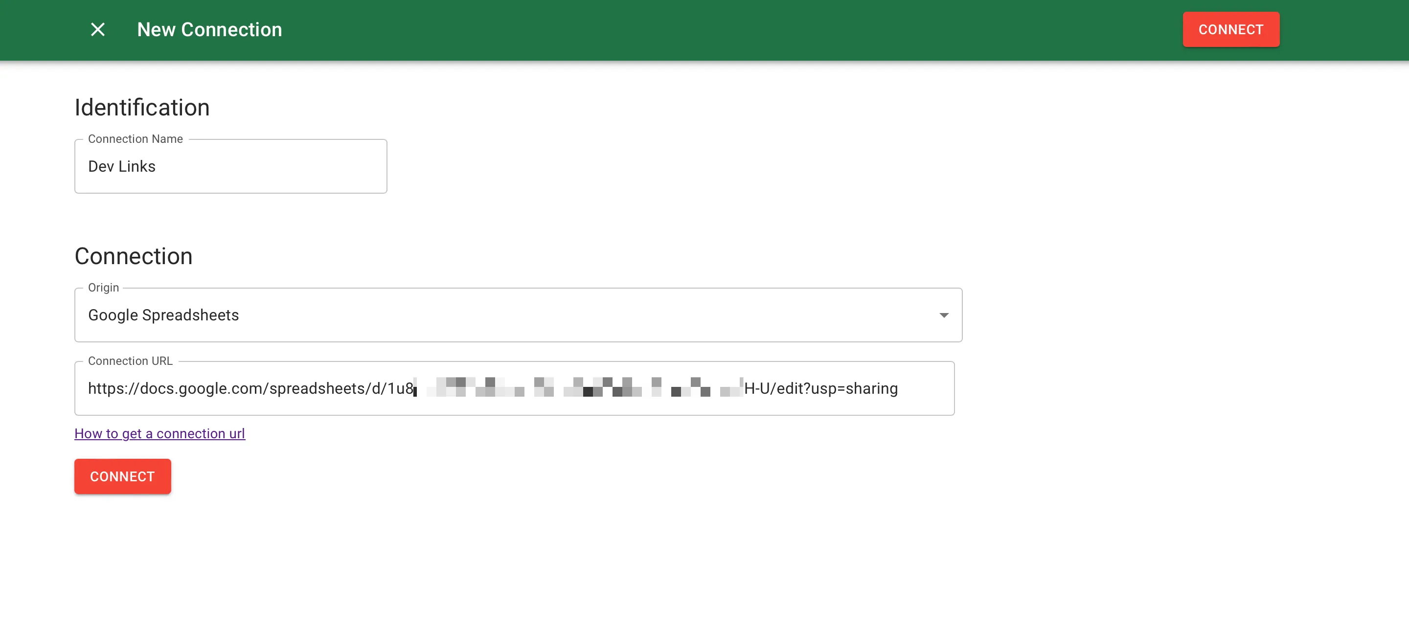 In the connection link, paste the link of the google sheet that was created in the previous step. Make sure to change the settings to Anyone on the internet with this link can view else it will not work.