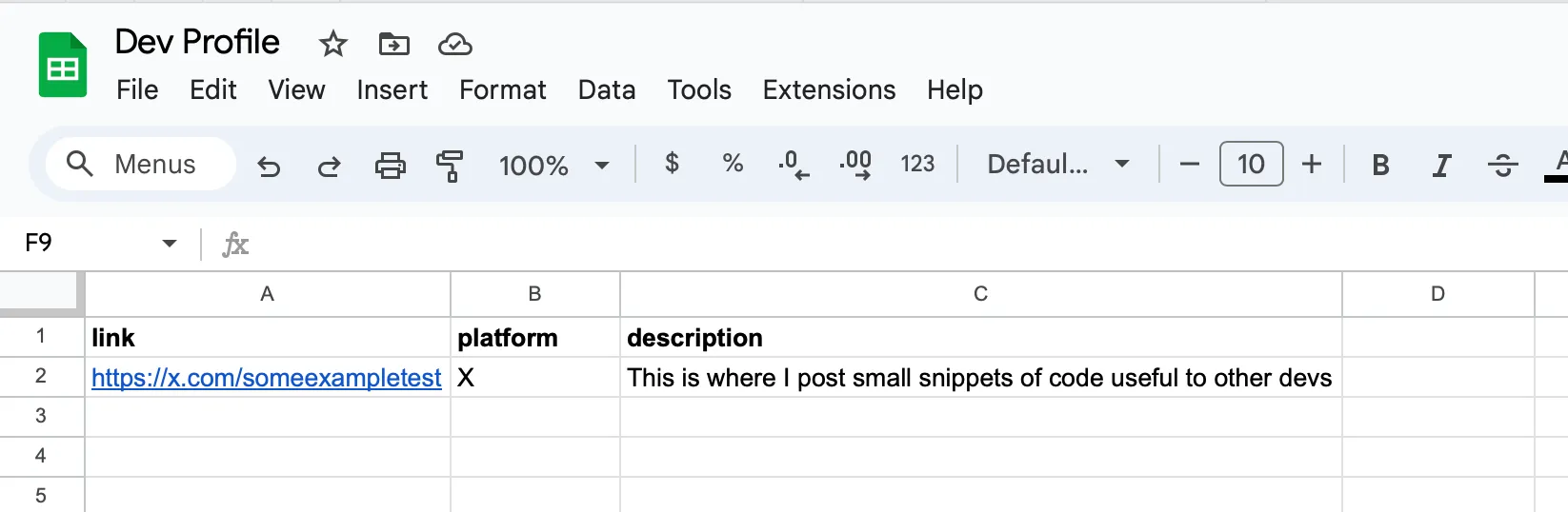Go to the Chrome browser address bar and type sheets.new to generate a new sheet. The first row will be used as metadata so provide the column names in the first row. Insert some data in the second row. My sheet currently looks like this: